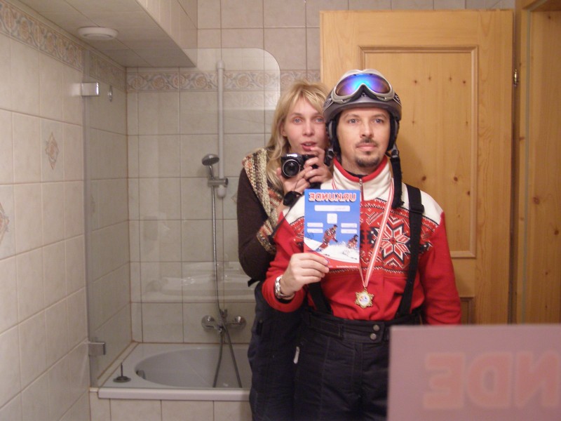 (на шее у меня "золотая медаль" за лучшее время в слаломе среди новичков лыжной школы; в руке диплом к медали; рядом