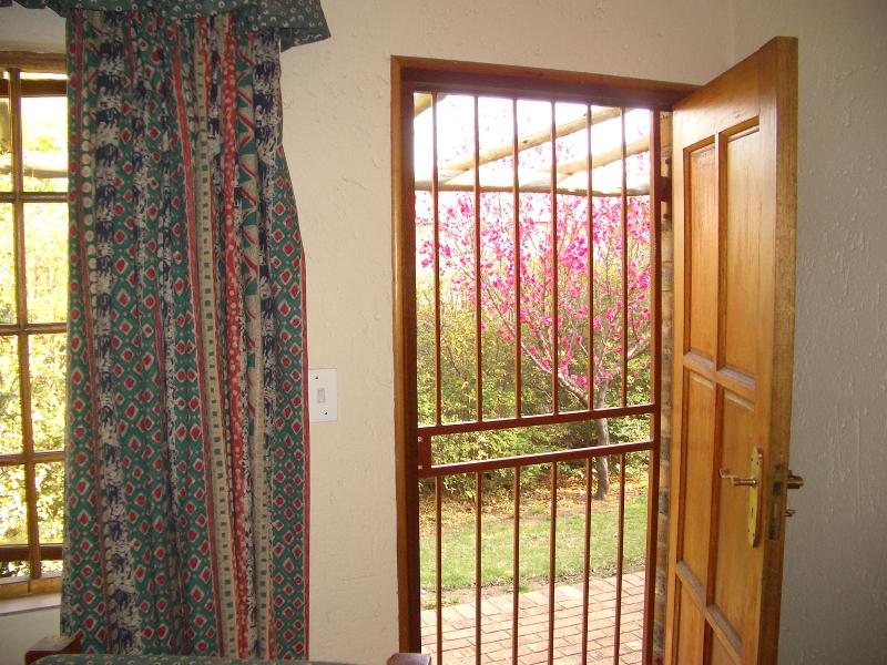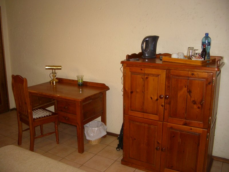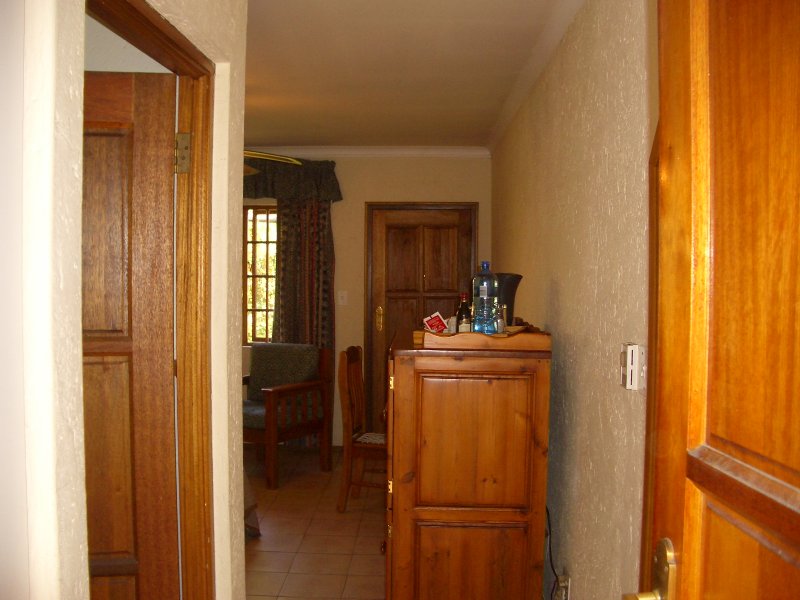 Жилище. Живу я не в гостинице, а в так назывемом guest house -- очень распостранённая вещь в ЮАР. Огороженный участок земли с лужайками, теннисным кортом, бассейном, огромной "беседкой" и рядом небольших домиков (так и хочется сказать "бунгало"). Всё выдержано в традиционном стиле, современных материалов (пластика и т.п.) минимум: крыша из настоящей черепицы, стены из дерева, не говоря уж о мебели. Очень позитивное ощущение, находиться в таком доме.